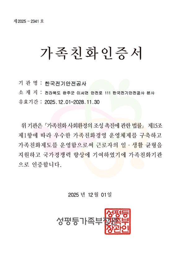 [아이뉴스24 김양근 기자] 한국전기안전공사(사장 남화영)는 최근 성평등가족부가 주관하는 ‘가족친화인증기관’으로 12년 연속 선정됐다고 11일 밝혔다.
