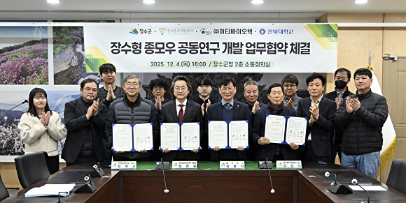 이번 협약은 협약기관 간 상호 업무협조 체계를 구축해 장수 한우 산업의 경쟁력을 높이기 위한 장수 지역 사양환경에 적합한 우수 유전자원을 확보하고, 탄소배출을 줄이면서도 생산성과 품질을 높일 수 있는 종모우 개발을 위해 마련됐다.