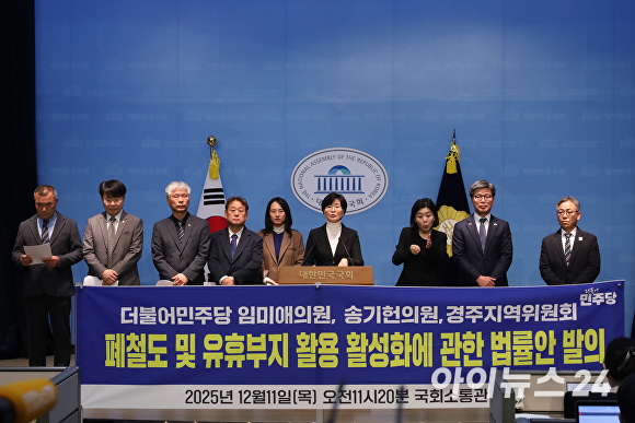 [아이뉴스24 김은경 기자] 더불어민주당 임미애 의원이 더불어민주당 경주지역위원회와 함께 ‘폐철도부지 활용 활성화법’ 발의 기자회견을 열고, 폐철도 및 철도유휴부지 활용을 촉진하기 위한 2건의 법안을 발의했다.