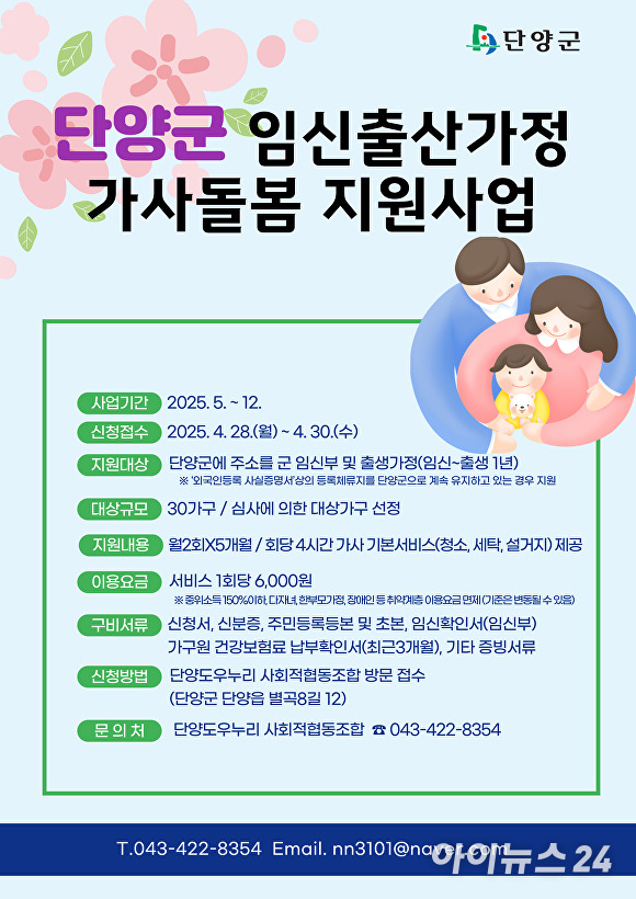 [아이뉴스24 이용민 기자] 충북 단양군이 대표 정책인 ‘임신·출산가정 가사돌봄 지원사업’이 저출생 대응 우수 정책으로 주목받고 있다.