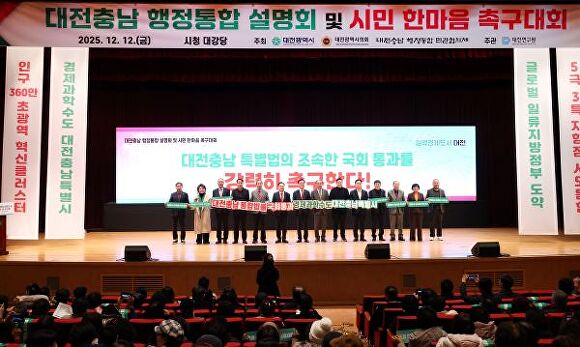 [아이뉴스24 강일 기자] 대전시는 12일 시청 대강당에서 대전시의회, 대전충남 행정통합 민관협의체와 공동으로 ‘대전충남 행정통합 설명회 및 시민 한마음 촉구대회’를 개최하고, 대전충남 행정통합 특별법안의 조속한 국회 심의․의결을 촉구했다.