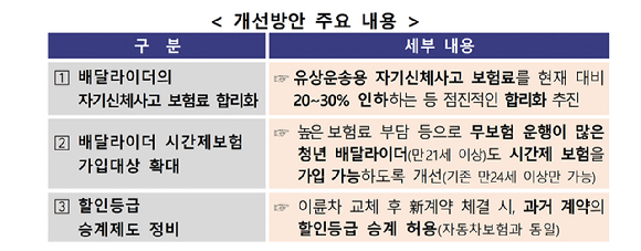 보험료 부담 문제로 무보험 운행이 많은 청년 배달 라이더의 시간제 보험 가입을 유도하기로 했다. 현재 만 24세 이상만 가입할 수 있으나, 만 21세 이상으로 완화한다.
