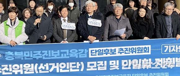 충북교육연대 등 도내 진보 성향 25개 단체로 구성된 충북민주진보교육감 단일후보 추진위원회(추진위)는 15일 도교육청 앞에서 기자회견을 열고, 후보 단일화 방식과 경선 일정 등을 발표했다.