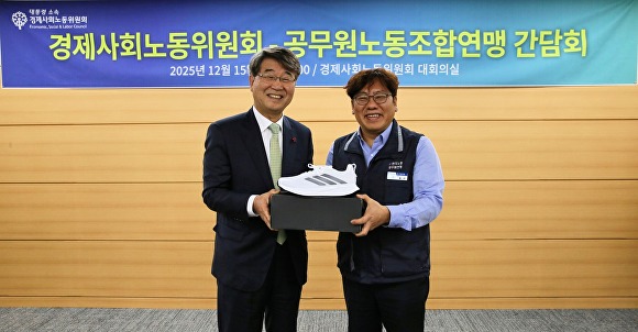 특히 이날 간담회 후 공무원연맹은 공직사회 현안에 귀 기울이고 국민 공감대 형성 등 사회적 대화에 열심히 뛰어 달라는 의미에서 경사노위 위원장에게 운동화를 전달했다.