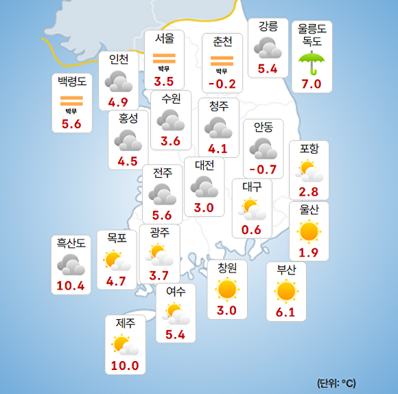 부산지방기상청에 따르면 이날 오전 9시 현재 주요 지역의 기온은 부산 6.1도, 울산 1.9도, 창원 3도로 기록됐다.