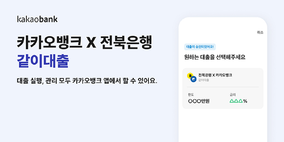 ‘같이대출’은 전북은행과 카카오뱅크가 5 대 5 비율로 대출을 분담해 제공하는 공동 대출 상품이다. 고객은 카카오뱅크 앱에서 한 번의 신청 절차로 양 금융기관의 심사 역량과 자금 공급 기반을 동시에 활용하고 안정적인 대출 한도와 조건을 제공받을 수 있다.