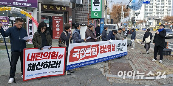 [아이뉴스24 임승제 기자] 경남 밀양·의령·함안·창녕 지역 농민회와 시민단체 회원 10여명이 17일 오전 경남 밀양시 삼문동 소재 박상웅 국민의힘 국회의원 지역 사무실 앞에서 '내란의힘 해산하라', '국민의힘 청산의날' 문구가 적힌 펼침막을 내걸고 국민의힘 해산을 촉구하고 있다.