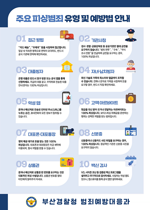 [아이뉴스24 박채오 기자] 부산경찰청은 증가하는 기관 사칭·대출 빙자 등 각종 피싱범죄에 효과적으로 대응하기 위해 개인택시 자율방범대와 협력해 시민 대상 '범죄예방 메신저' 활동을 전개한다고 17일 밝혔다.