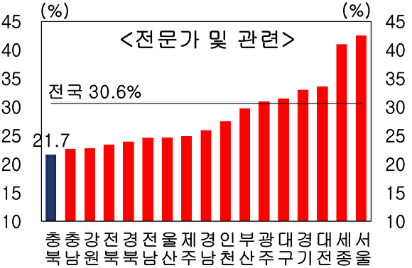 산업별로 보면 전국보다 제조업 취업 비중은 높지만, 서비스업 취업 비중은 낮은 점이 눈에 띈다. 특히 전문직 종사자 비중은 17개 시・도 중 가장 낮다.