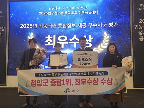 청양군은 농림축산식품부가 실시한 ‘2025년 귀농귀촌 통합정보 제공 우수 시·군 평가’에서 전국 1위로 최우수상을 수상했다고 18일 밝혔다.