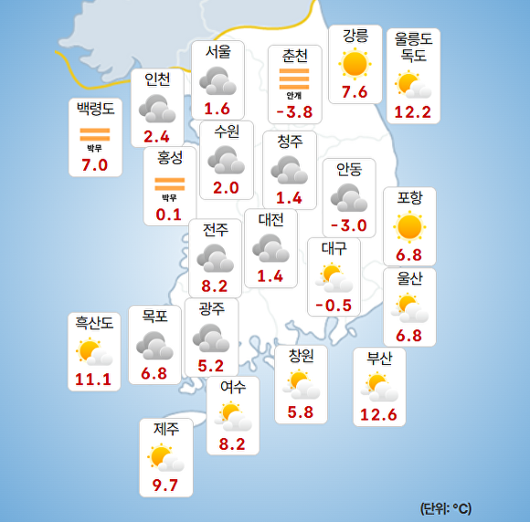 부산지방기상청에 따르면 이날 오전 9시 현재 주요 지역의 기온은 부산 12.6도, 울산 6.8도, 창원 5.8도로 기록됐다.