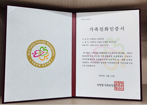 증평군은 지난 2014년 첫 가족친화인증을 받은 이후 2017년과 2019년, 2022년 재인증을 거쳐 올해 또다시 재인증을 받았다. 기간은 오는 2028년 11월까지 3년.