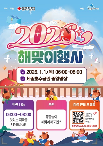 [아이뉴스24 강일 기자] 2026년 1월 1일 세종호수공원에서 병오년(丙午年) 해맞이 행사가 열린다. 이번 해맞이 행사는 대한적십자사봉사회 세종시지구협의회 주관으로 2026년 1월 1일 오전 6시부터 시작한다.