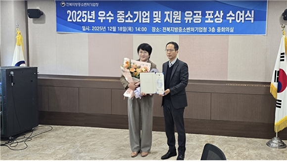 이번 표창은 중소기업 발전과 지역경제 활성화에 기여한 개인과 기관을 대상으로 수여되는 정부 포상이다. 시상식은 지난 18일 전북지방중소벤처기업청에서 열렸다.