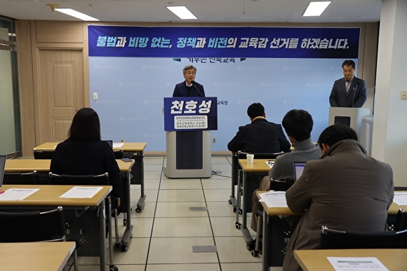 [아이뉴스24 박종수 기자] 천호성 전북미래교육연구소 소장(전주교대 교수)은 22일 내년 전북 교육감 선거에서 불법과 비방 없는 선거를 치르겠다고 선언했다.
