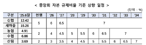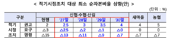 조합 단계에서는 순자본 비율을 높여 손실 흡수능력을 확충할 계획이다. 신협·수협·산림조합의 최소 순자본 비율을 2030년까지 4%로 올리고, 신협에는 경영개선명령 제도를 새로 적용한다.