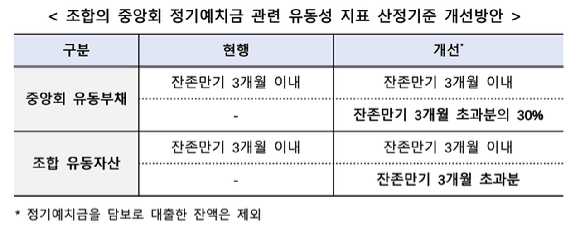 금융위는 중앙회의 대체투자 유가증권에 자산건전성 분류를 의무화해 평가 관행을 정교화하기로 했다. 조합 예치금의 일부를 유동성 지표에 반영하는 방식으로 유동성 관리 체계도 재정비한다.