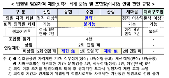 금융위는 지배구조도 개편해 임원 자격 제한 요건을 '지배구조법' 수준으로 높이기로 했다. 우선 농협·수협·산림조합 퇴직 임직원 제재 근거를 마련한다.