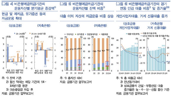 자금 운용에서는 비은행예금취급기관이 대출 자산보다 현금·예치금·유가증권 등 수익성이 낮은 자산 운용 비중을 확대했다. 상호금융은 대출 채권이 증가했지만 대출 외 자산이 더 빠르게 늘었고, 저축은행은 대출 감소 속에서 유동성 확보 목적의 현금·예치금과 PF 구조조정 펀드 출자 관련 유가증권이 증가했다.