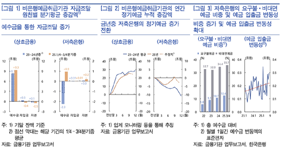 자금조달 측면에서 상호금융은 2023년~2024년 둔화했던 예수금 증가세가 올해 들어 다시 확대됐다. 저축은행도 PF 부실 여파로 줄던 예금이 올해 들어 정기예금 중심으로 증가로 전환했다. 다만 저축은행은 요구불예금·비대면 예금 증가로 예금 변동성이 추세적으로 커졌다.