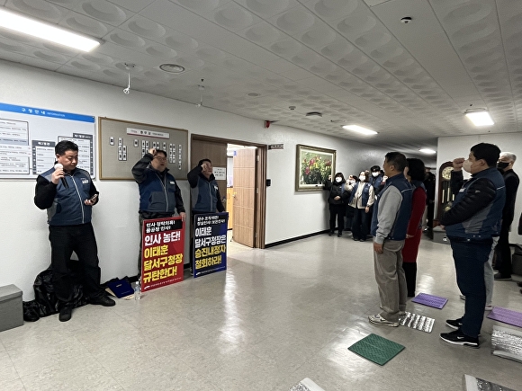 달서구지부 조합원 약 150명은 이날 오전 구청장 집무실 앞에서 약 30분간 출근 저지 집회를 진행했다.