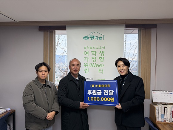 [아이뉴스24 안영록 기자] 홍원희 ㈜신화아이티 대표이사가 23일, 위기청소년을 위해 써달라며 충북도교육청 여학생 가정형 위(Wee)센터(센터장 임선영)에 100만원을 기탁했다.