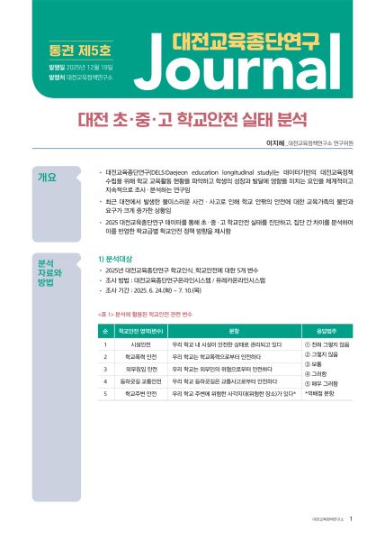 이번에 발간된 제5호는 ‘대전 초·중·고 학교안전 실태 분석’, 제6호는 ‘대전 교육가족의 정신건강 현황 분석’을 주제로 구성됐다. 두 저널은 대전교육종단연구 온라인시스템을 통해 수집한 제2차 종단데이터를 바탕으로 통계 분석한 연구 결과물이다. 조사 대상은 초5·중2·고2 학생과 해당 학년 학부모, 교사, 학교장, 행정직원 등이다.
