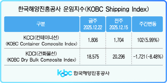 한국해양진흥공사(해진공)가 지난 23일 발표한 KCCI에 따르면 이 지수는 전주 대비 102포인트(5.99%) 오른 1806을 기록했다.
