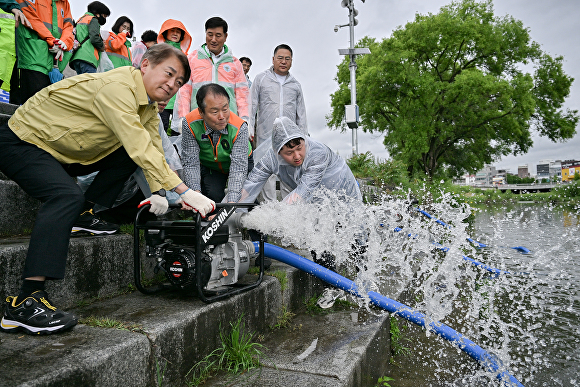 광주 서구가 지난 5월 '풍수해 대비 양수기 가동 민·관 합동훈련'을 실시하고 있다. [사진=광주시 서구]