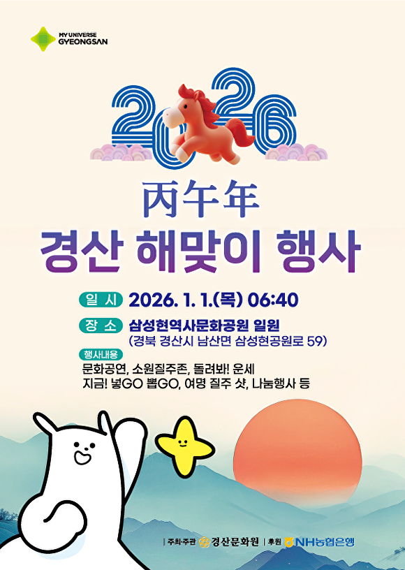 [아이뉴스24 이창재 기자] 경북 경산시(시장 조현일)는 2026년 1월 1일 삼성현역사문화공원 야외무대에서 ‘2026 병오년 경산 해맞이 행사’를 개최한다고 29일 밝혔다.
