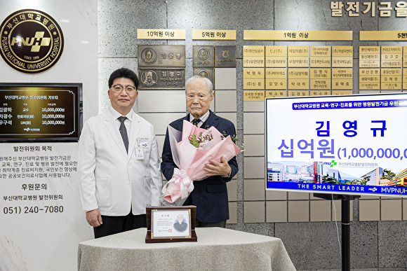 김영규 전 회장은 “이재일 교수님의 마음까지 아우르는 헌신적인 진료 덕분에 부산대병원에서 건강을 되찾을 수 있었고, 의료진과 병원의 노고에 보답하고자 기부를 결심하게 됐다”며 “이 기부금이 병원의 교육과 연구, 의료환경 개선을 위한 시설 투자에 의미 있게 사용되기를 바란다”고 말했다.