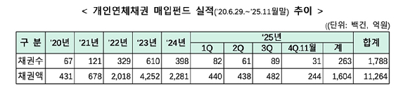 이에 올해 11월 말까지 약 17만 9000건, 1조 1264억원의 개인 연체채권을 매입해 연체 채무자의 추심 부담을 완화하고 재기를 지원했다.
