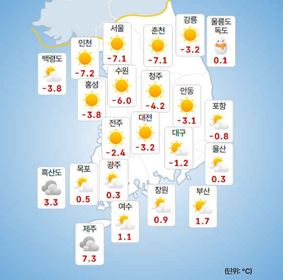 부산지방기상청에 따르면 이날 오전 9시 현재 주요 지역의 기온은 부산 1.7도, 울산 0.3도, 창원 0.9도로 기록됐다.
