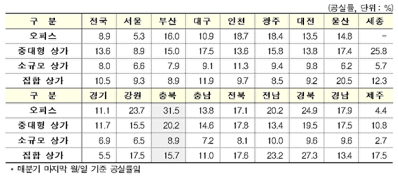 특히 오피스 공실률은 17개 시·도 중 1번째로, 중대형상가는 2번째로 높게 나타났다.