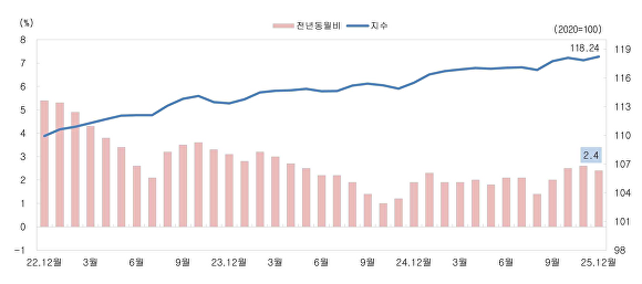 한편 2025년 연간 소비자물가지수는 117.24로 전년대비 2.1% 올라 비교적 안정된 것으로 나타났다.