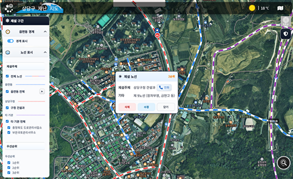 ‘상당맵’은 홍수와 산사태의 실시간 위험도, 도로 등 시설물 통제 정보, 무더위 쉼터와 민방위 대피소 위치정보, 빗물받이 신고 및 처리 시스템, 겨울철 제설 노선 정보 등이 총망라된 종합 재난 포털 지도다.