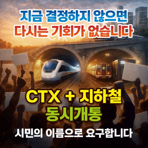 일부에서는 지하철 동시개통을 두고 ‘비용 부담’을 운운한다. 그러나 이는 가장 비겁한 변명이다. CTX 건설 단계에서 함께 설계할 경우 추가 비용은 약 7천억 원 수준이다. 반대로 지금 이를 외면하면, 장차 수조 원대 중복 투자와 도시 단절이라는 대가를 시민과 미래 세대에게 떠넘기게 된다. 지금 7000억원을 아끼겠다는 선택은, 결국 몇 배의 비용을 치르겠다는 선언과 다르지 않다.