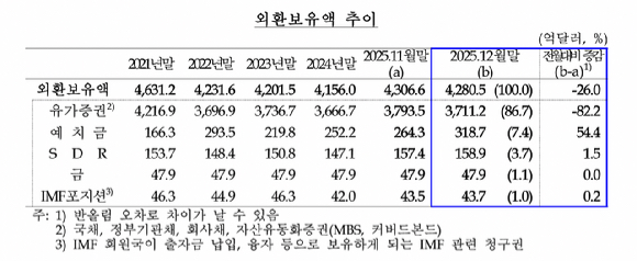 [아이뉴스24 신수정 기자] 지난해 12월 우리나라 외환보유액이 4280억 5000만달러로 전월 대비 26억달러 줄었다.