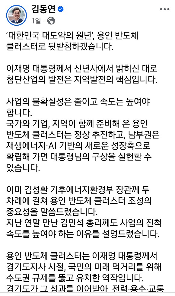 앞서 김 지사는 지난 4일 자신의 페이스북에 ‘대한민국 대도약의 원년, 용인 반도체 클러스터로 뒷받침하겠습니다’라는 글을 통해 “용인 반도체클러스터 정상 추진을 위해 김성환 기후에너지부 장관과 두 차례 만나 조성의 중요성을 설명했고, 김민석 국무총리에게도 사업 진척 속도를 높여야 하는 이유를 전달했다”고 밝혔다.