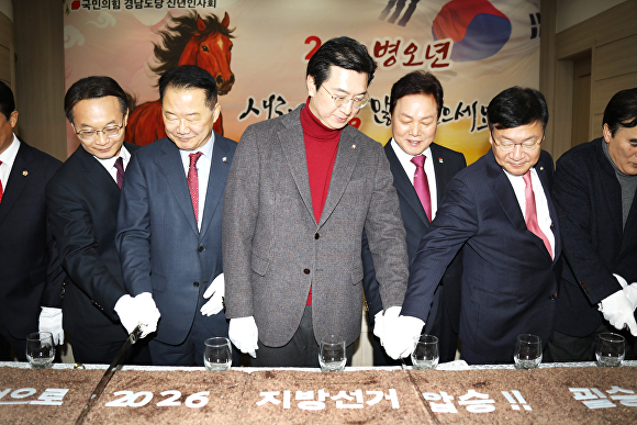 강민국 도당위원장 등 주요 당직자들은 "변화와 개혁으로 2026 지방선거 압승!! 필승!!"이라는 문구가 새겨진 시루떡을 함께 컷팅하며 새해 각오와 지방선거 승리 결의를 다졌다.