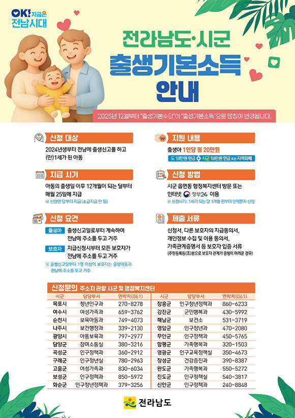 전남도는 지난해 11월 기본사회 흐름을 반영해 ‘전라남도 출생기본소득 지급에 관한 조례’를 개정하고, 제도 명칭을 출생기본수당에서 출생기본소득으로 변경했다.