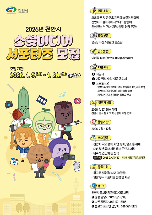 모집 대상은 지역·성별·연령과 관계없이 천안시 소셜미디어 활동에 관심이 있고 영상·사진·블로그 포스팅 가운데 한 가지 이상의 제작 경험이나 역량을 갖춘 시민이다.