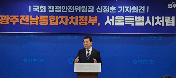 [아이뉴스24 한봉수 기자] 신정훈 국회 행정안전위원장은 광주광역시의회에서 기자회견을 열고 “광주·전남 대통합을 통해 분권형 국가로의 대전환을 이루고, 대한민국 재도약의 길을 열겠다”고 밝혔다.