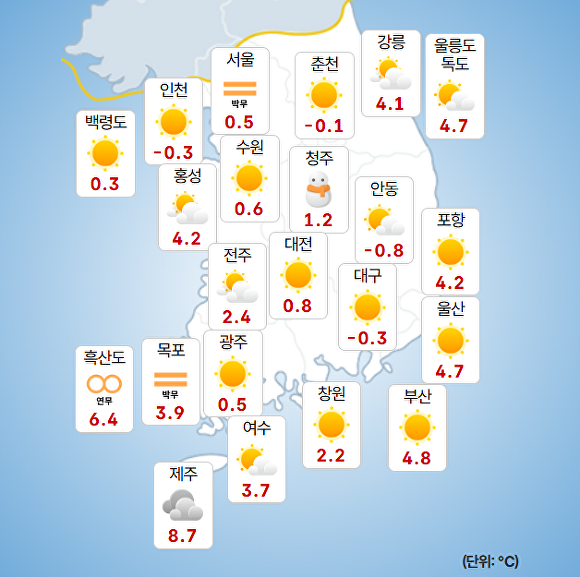 부산지방기상청에 따르면 이날 오전 9시 현재 주요 지역의 기온은 부산 4.8도, 울산 4.7도, 창원 2.2도로 기록됐다.