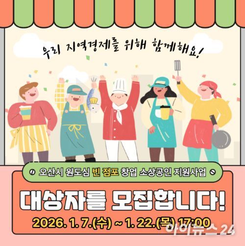 [아이뉴스24 김장중 기자] 경기도 오산시가 오산역 앞 아름다로(구 문화의 거리) 일대 원도심의 빈 점포를 활용한 창업 소상공인에게 임차료를 지원하는 ‘원도심 빈 점포 창업 지원’사업 대상자를 이달 22일까지 공개 모집한다고 밝혔다.