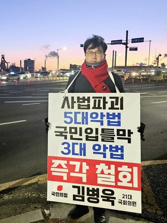 [아이뉴스24 이진우 기자] 국민의힘 소속 김병욱 포항시장 출마 예정자가 새해 첫 출근일을 전후해 포항 도심 주요 교차로에서 1인 피켓 시위에 나서며, 사법·언론 관련 법안과 공천 비리 의혹을 둘러싼 정치권 논란을 정면으로 비판했다.