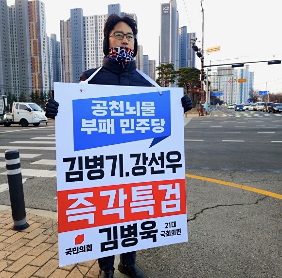김병욱 출마 예정자는 지난 4일부터 새벽 시간대를 중심으로 형산강다리 인근 로터리와 대잠사거리 등 출근길 유동 인구가 많은 지점에서 잇따라 1인 시위를 진행했다. 현장에는 '사법파괴 5대 악법', '국민입틀막 3대 악법 즉각 철회', '공천뇌물·공천현금당 특검' 등의 문구가 적힌 피켓을 들고 시위에 나섰다.