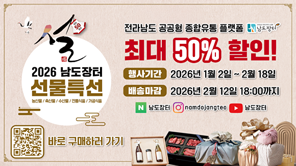 남도장터는 2026년 1월 2일부터 2월 18일까지 47일간 대규모 '설 명절 기획전'을 진행한다. 물가 부담은 낮추고 농가 소득은 높이는 상생 기획전으로 270개 업체·1400여개 품목이 참여한다.