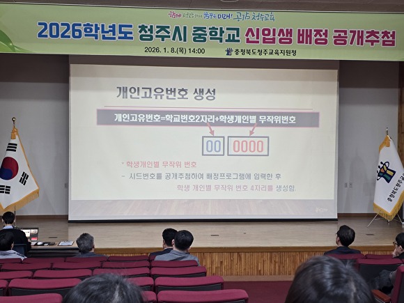 청주교육지원청은 이날 대회의실에서 2026학년도 청주시 중학교 신입생 컴퓨터 공개 추첨을 통해 7개 학교군에 7412명, 8개 중학구에 634명을 배정했다.