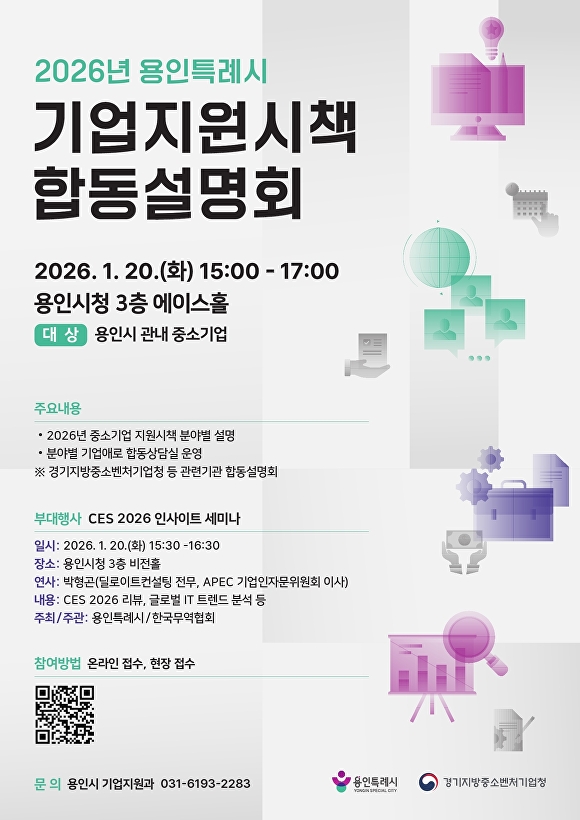이밖에 이날 오후 시청 비전홀에서는 ‘국제전자제품박람회(CES) 2026 인사이트 세미나’가 열린다. 세미나에서는 CES 2026의 주요 내용과 국제 기술 동향 분석, 용인시단체관 참가 기업의 수상 사례 공유 등이 이뤄진다.